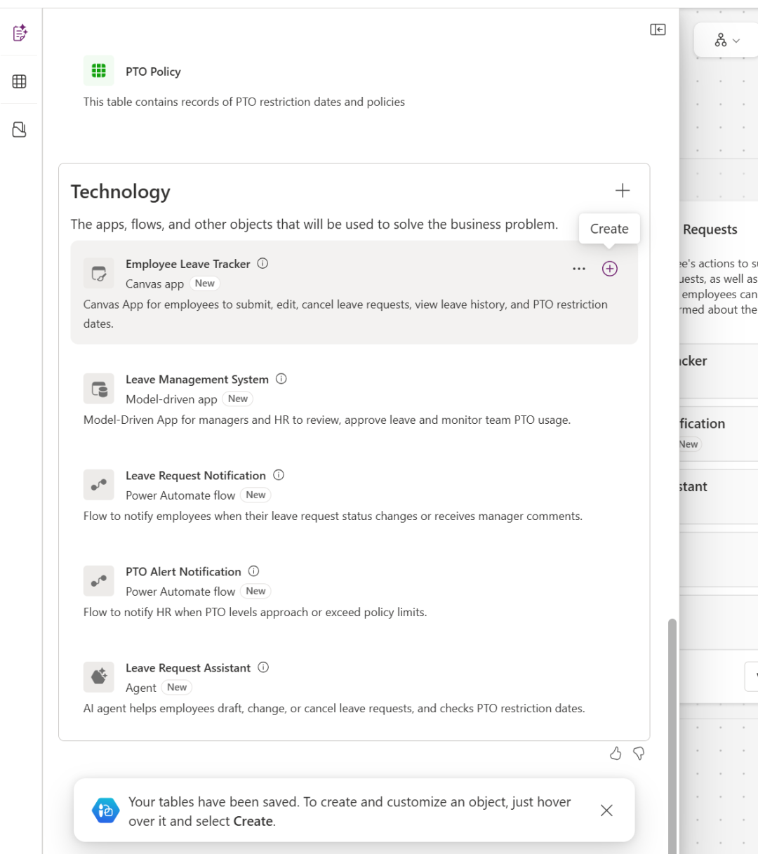- 等需求明确后,它登场了。它会建议一套 Dataverse 表来存储业务信息,包括推荐的列、数据类型和表之间的关系。