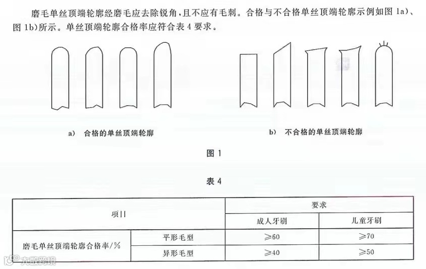 磨毛不合格是进口牙刷最常见的检测问题。标准规定非磨尖丝刷毛必须经磨毛处理以消除锐角和毛刺,防止损伤牙龈。成人平形/异形毛型牙刷磨毛合格率应≥60%/40%,儿童产品则应≥70%/50%[k]。