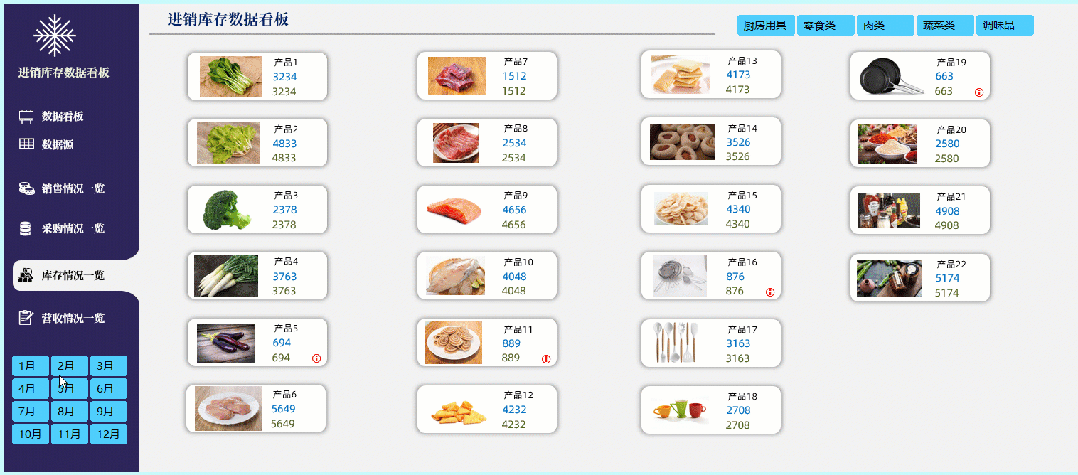 分别把销售情况,采购情况,库存情况,营收情况,做了4个页面的区分.