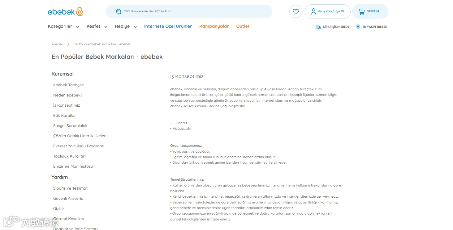 Bebek.com 是由刚生完孩子的父亲Halil Erdoğmuş出于获取婴儿护理信息的需要而创立的,自 2001 年以来一直为父母和准父母提供服务。ebebek 致力于为正在考虑生孩子、怀孕和抚养孩子的有意识的家庭提供他们所需的所有信息、服务和友谊,然后开发了 ebebek.com,以快速、实用的方式提供婴儿护理所需的产品和负担得起的条件。ebebek.com 是土耳其第一家婴儿用品在线商店。继网站成功后,ebebek通过应用“点击到实体”的商业模式转型为实体零售,这在世界上是罕见的。