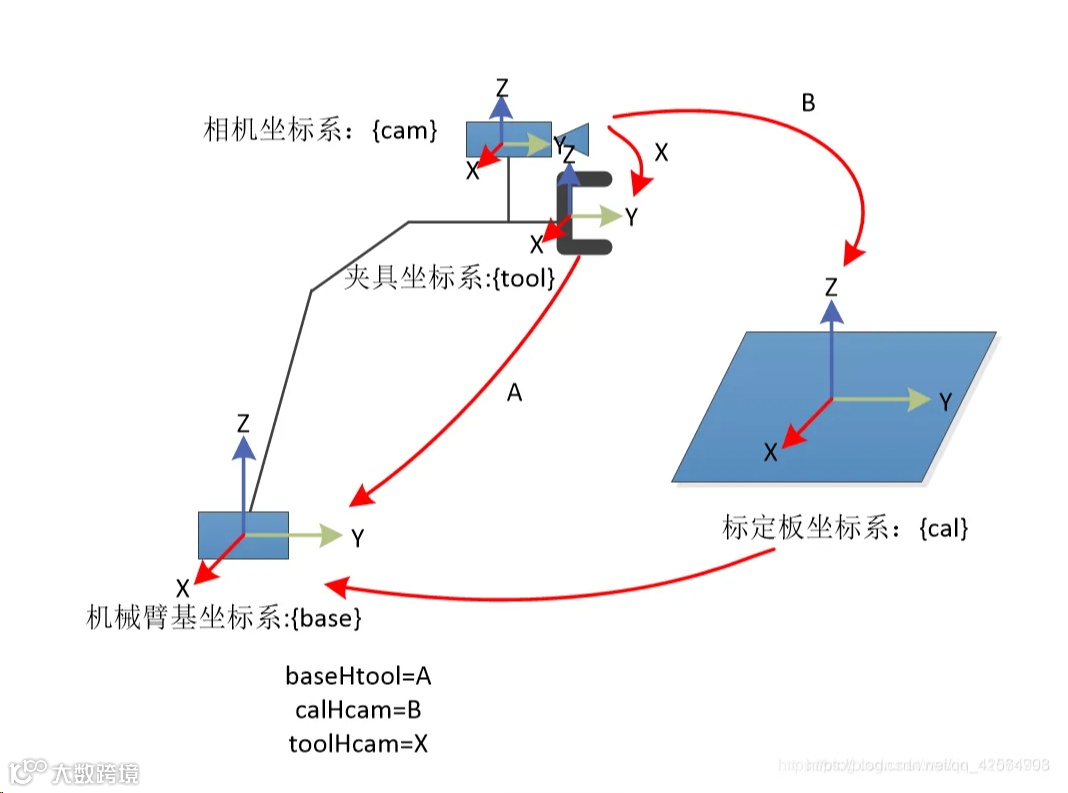 眼在手上(EyeInHand):相机固定安装在机械臂的末端工具上,随着机械臂的运动而运动,相机相对于机器人末端法兰是固定的,标定板相对于机器人基座是固定的。