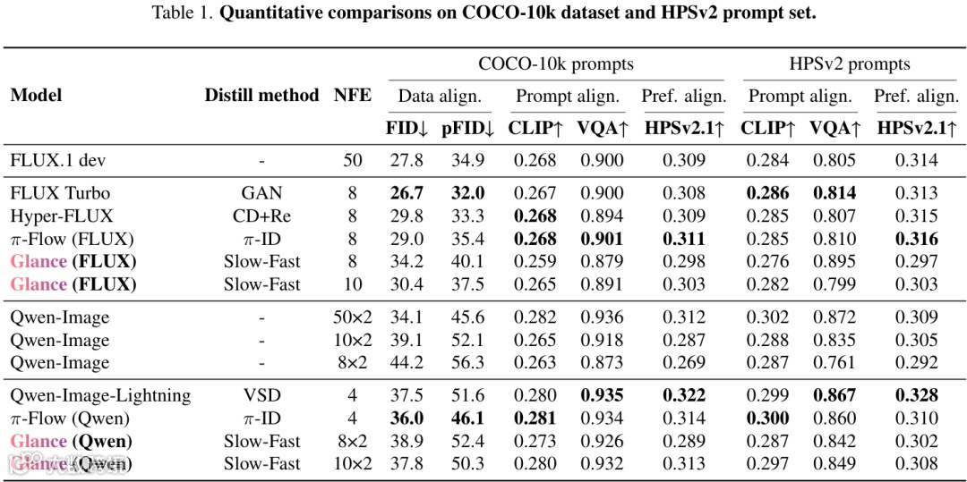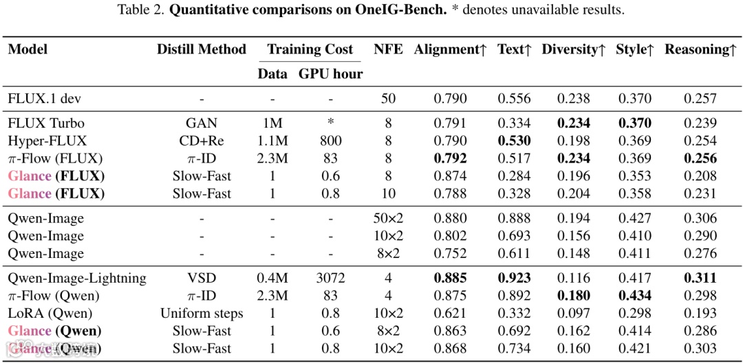 从上面两张表中的数据可以看出,Glance在大幅减少推理步数(NFE)的情况下,各项生成质量指标(如FID、CLIP Score等)与需要几十步推理的原始模型相比,虽有差距但依然保持了很强的竞争力,并且优于一些同样是少步数的模型。