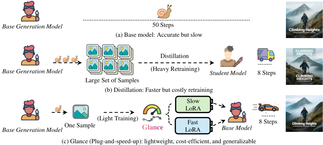 这是一篇相当有意思的论文,关于扩散模型加速。我们都知道,扩散模型虽然效果惊艳,但“慢”这个字一直是它绕不开的痛。为了让它跑得更快,学术界和工业界想尽了办法,比如模型蒸馏(Distillation),但通常需要海量数据和巨大的算力成本,让人望而却步。