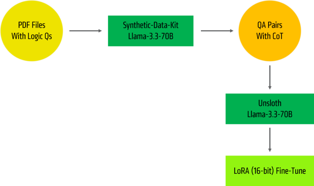 我们将先利用模型生成合成数据(逻辑题、答案与CoT(Chain-of-Thought,显式推理链)),再用这些数据对同一模型进行微调,以提升其在相关任务上的表现。流程概述: