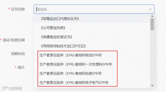 【上传证书】信息填写:认证检测→填写被认证主体名称→认证类型选择:监管许可证书。
