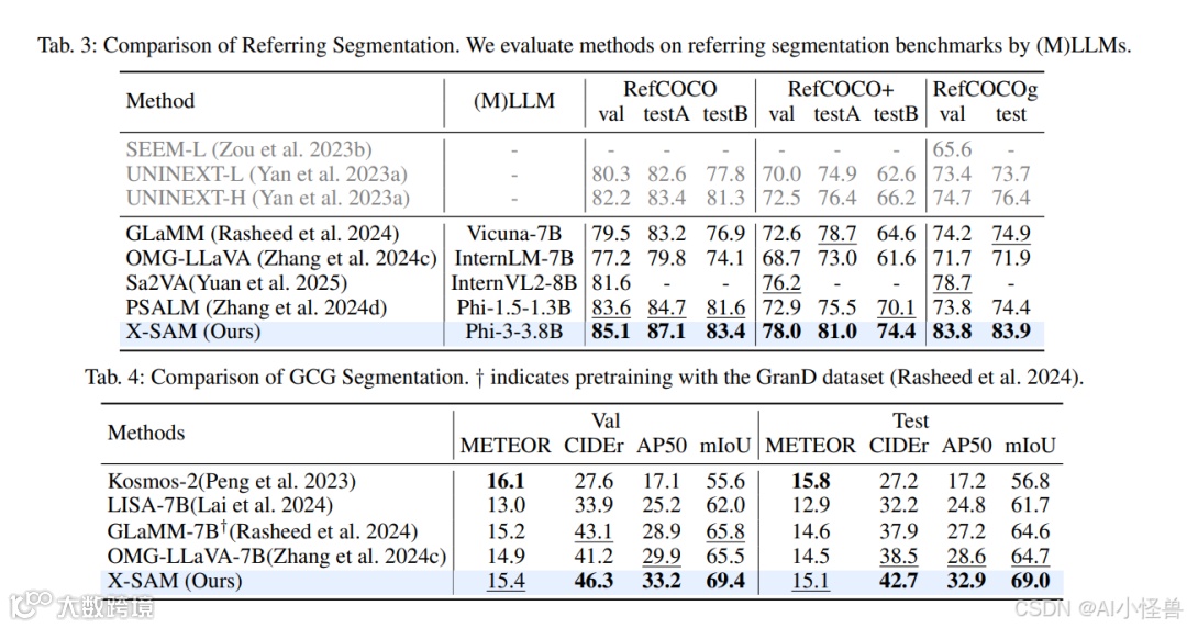 GCG分割。 接地对话生成需要细致的图像和像素级理解,要求MLLMs将描述的对象与其分割掩码联系起来。如表4所示,与先前的方法相比,X-SAM实现了显著的性能提升,并在Val集和Test集上都获得了最佳结果。在图像级理解方面,X-SAM在Val集上比GLaMM高出0.2% METEOR和3.2% CIDEr,在Test集上高出0.5% METEOR和4.8% CIDEr。在像素级理解方面,X-SAM在Val集上比OMG-LLaVA高出3.3% AP和3.9% mIoU,在Test集上高出4.3% AP和4.3% mIoU。