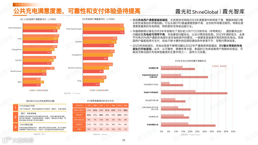 第二,美国充电用户满意度持续降低。华盛顿邮报记者在2023年年底暗访了洛杉矶126个CCS快充站(非特斯拉),遇到最突出的问题就是充电桩可用率不高,充电兼容问题突出,以及付费体验较差。2023年的调研显示,全美平均有20%用户遇到充电排队或充电桩损坏的情况,消费者只能直接离开,再找别的充电站。