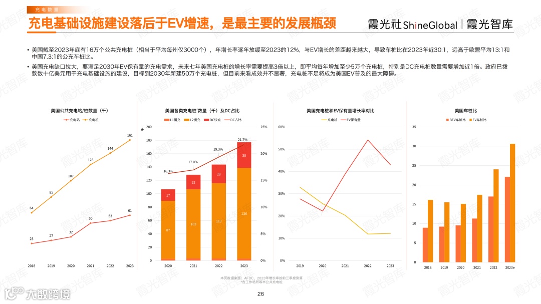 EV进程缓慢,导致了充电市场的不完善。截至2023年底,美国共有16万个公共充电桩,相当于平均每州仅3000个,车桩比近30:1,远高于欧盟平均13:1和中国7.3:1的公充车桩比。要满足2030年EV保有量的充电需求,未来七年美国充电桩的增长率需要提高3倍以上,即平均每年增加至少5万个充电桩,特别是DC充电桩数量需要增加近1倍。
