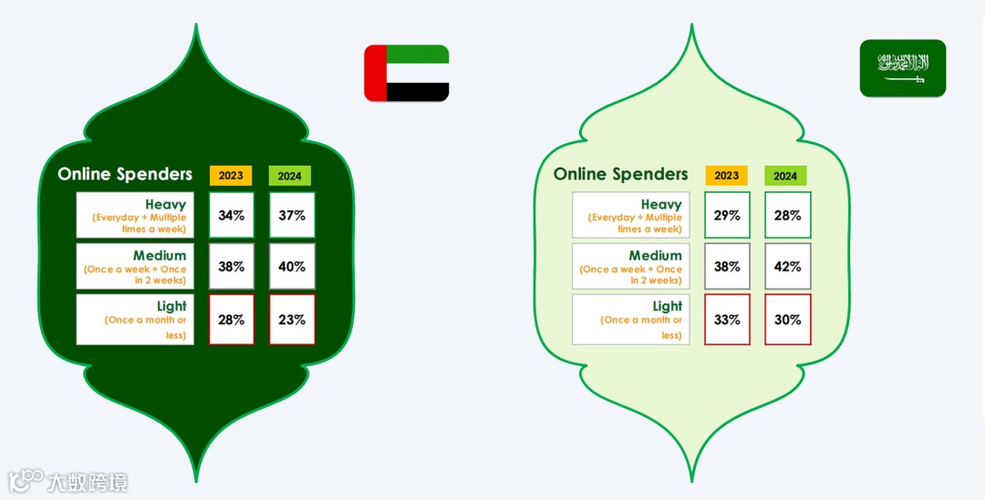 就消费渠道言,在阿联酋,中度到重度网上购物的人群呈 “上升趋势”。在沙特,网上购物者似乎正在从轻度向中度转变,而重度网上购物者则基本保持不变。