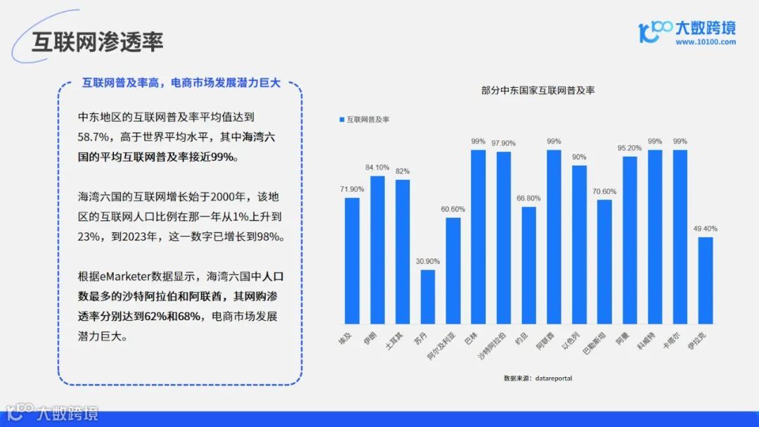 此外,中东地区的互联网普及率平均值达到58.7%,高于世界平均水平,其中海湾六国的平均互联网普及率接近99%。