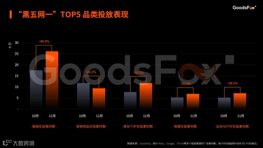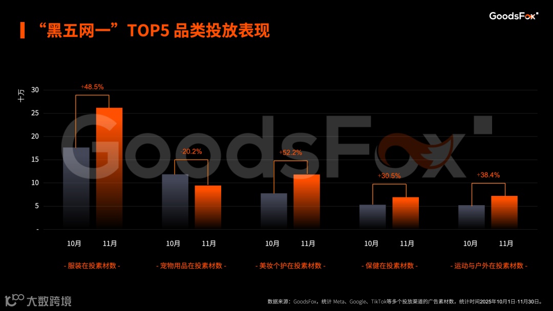 10-11月,广告投放量 Top5 的行业依次是:服装、美妆个护、宠物用品、运动与户外、保健。