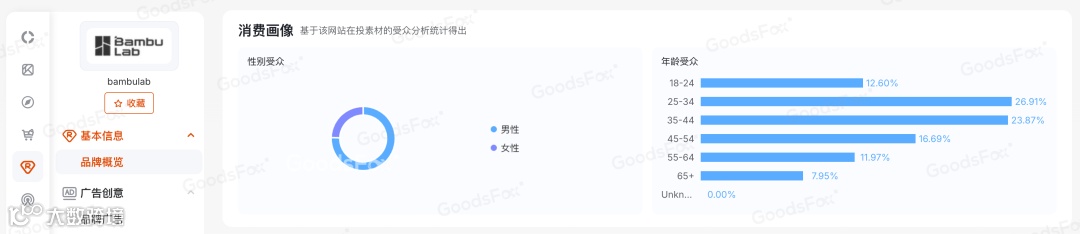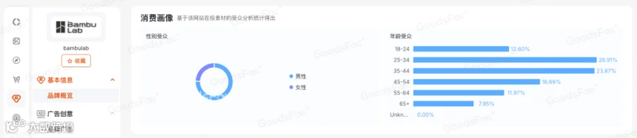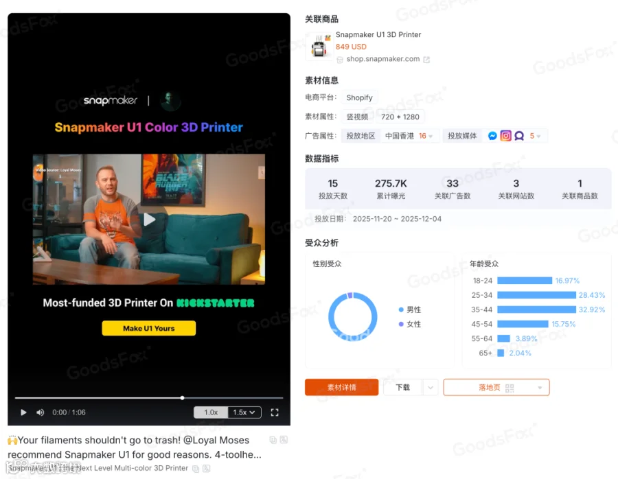 从 GoodsFox 的数据来看,3D 打印广告主要集中在北美与欧洲,受众以 25–45 岁男性为主。