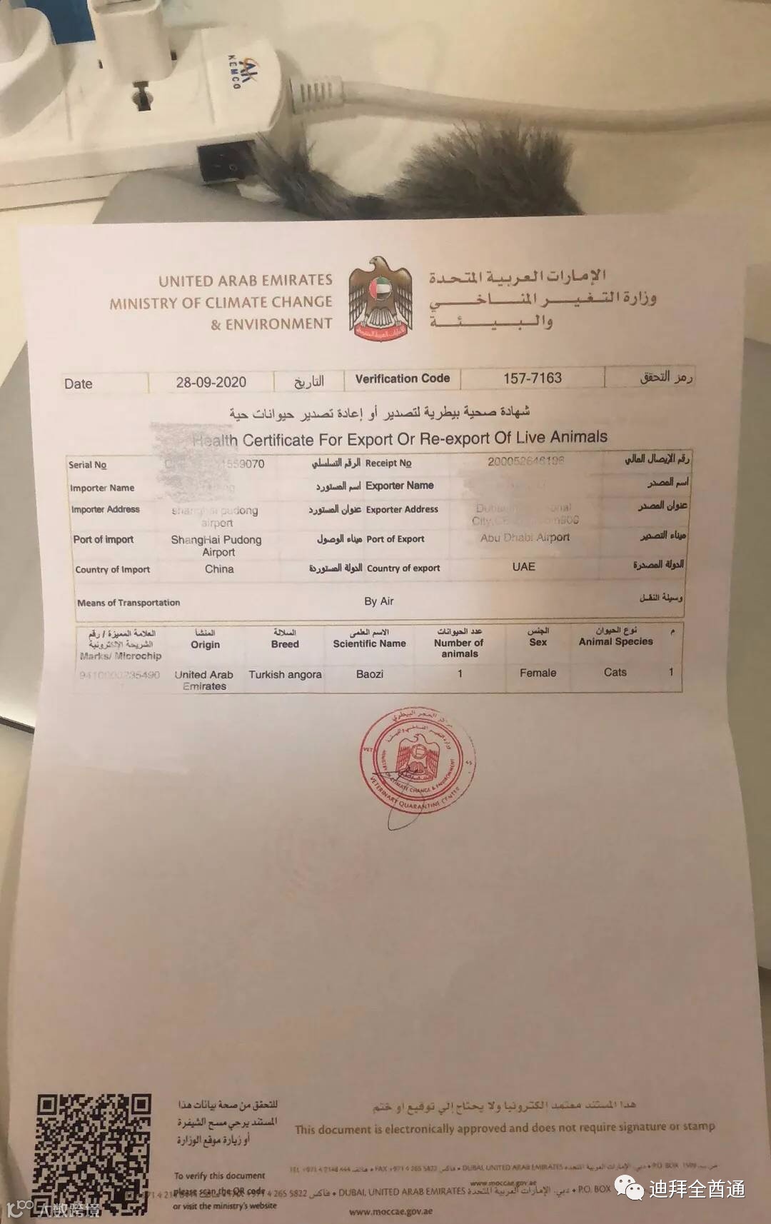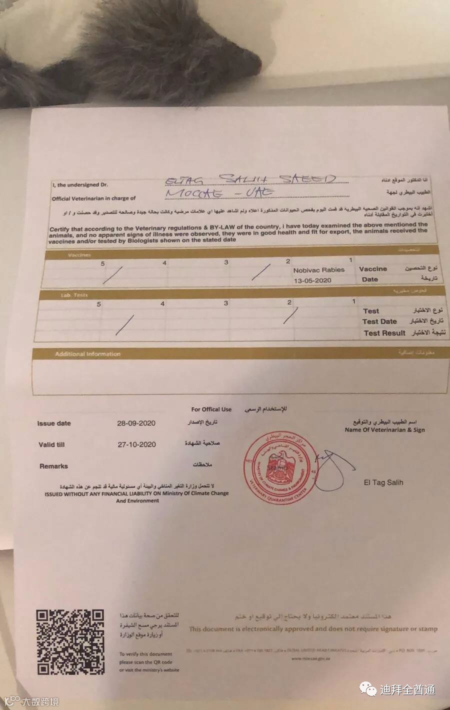 4. 出口许可(Export Permit):由阿联酋气候变化与环境部(Ministry of Climate Change & Environment)签发,需提前官网预约并携带宠物、血清报告、护照等材料现场办理,有效期为签发后10天内[k]。