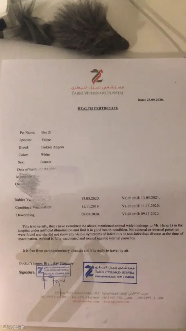 2. 血清检测报告与宠物芯片:血清检测须由中国海关认可的实验室出具,阿联酋认可机构为Central Veterinary Research Laboratory。推荐前往Zabeel Veterinary Hospital办理,该医院可协助送检并提供宠物芯片植入服务,报告通常5-21天内出具。检测报告有效期较长,航班延误不影响其有效性[k]。