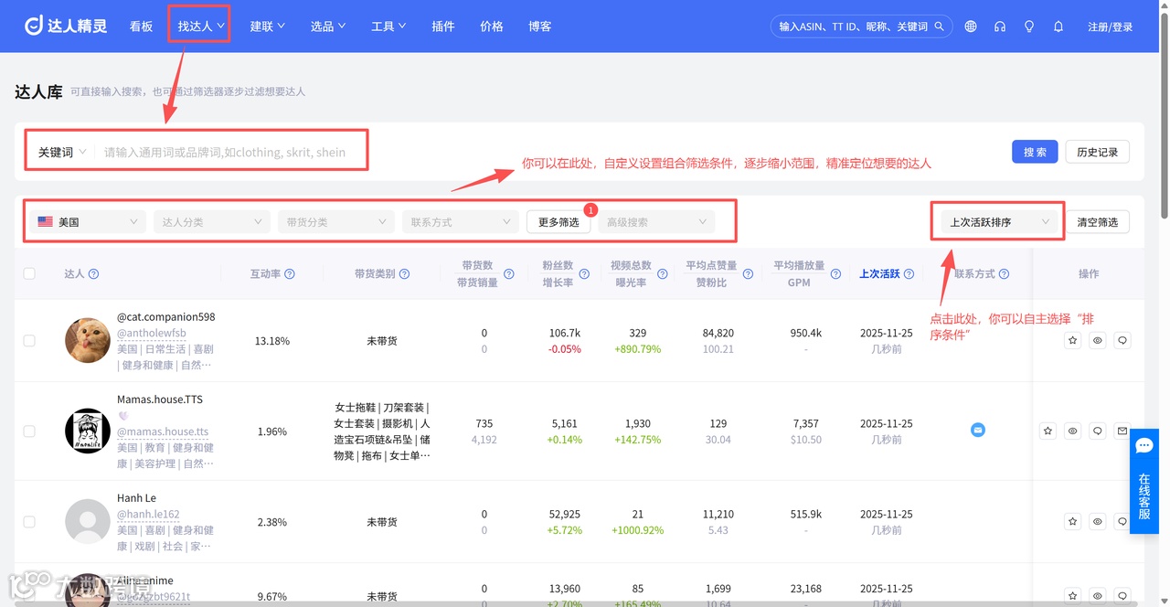 多场景覆盖的达人发现与精准挖掘:达人精灵的「找达人」功能,提供“热门/新兴/互动带货达人排行榜”等全方位的达人数据榜单,能够帮助跨境卖家快速发现意向达人;同时,它还汇集了TK平台海量达人资源,提供「达人搜索」模式,通过输入关键词及多维条件筛选模式,让跨境卖家可以精准筛选垂类精准达人;