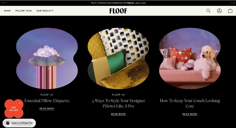 作为一般规则,选择两种字体:一种用于标题,一种用于正文(这可能不包括您在品牌文字标记中使用的字体)。本土品牌Floof使用一种无衬线字体用于导航和标题,另一种衬线字体用于其余文本。请注意,它的徽标(其品牌名称的简单文字标记)是一种独特的字体,未在其他任何地方使用: