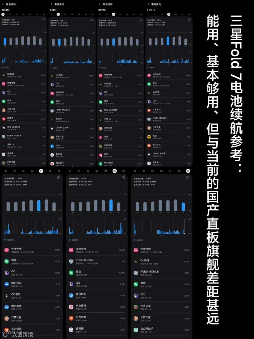 🔋其实我们本来对Fold 7的续航是不报任何希望的,毕竟祖传4400毫安时的电池,再怎么优化也不会有质的飞跃,但实际体验下来7代的续航还是超出期待的:WiFi下看网络视频预计能用8小时,日常室内WiFi环境下使用预计6小时,WiFi下纯玩游戏3小时左右。虽然还是外出必备充电宝的水平,但是低信号环境待机掉电、后台控制方面已经比之前几代进步了不少。