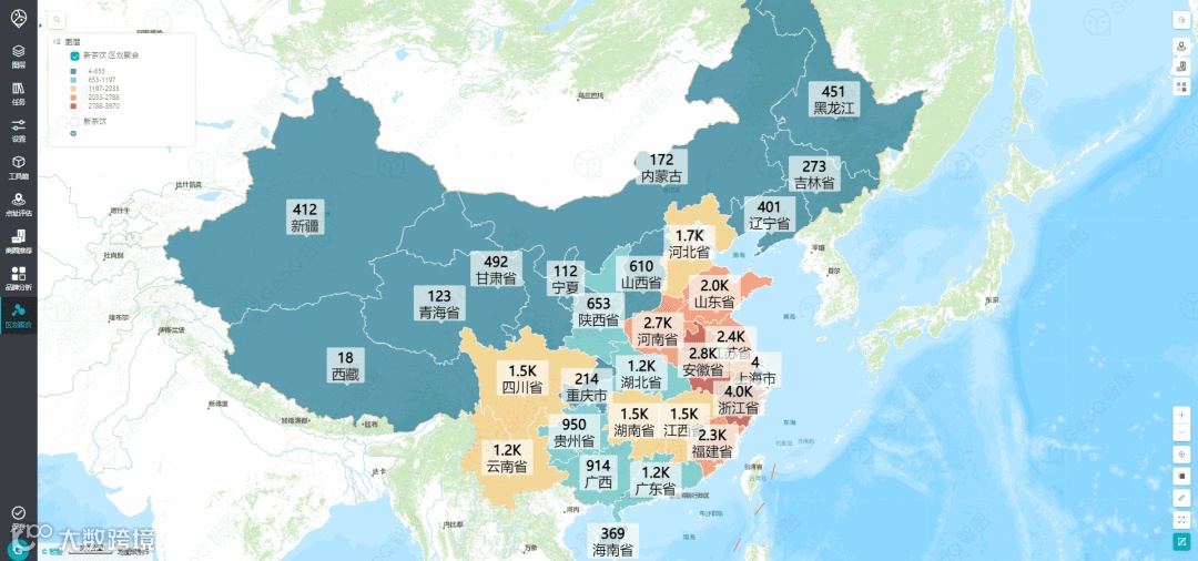 根据第三方机构GeoQ Data品牌数据,去年1-12月初,全国县域新开连锁茶饮门店超过了9000家,整体开店率约为36%。平均每个县域拥有17.27家连锁奶茶店,这也颠覆不少人对县城茶饮市场的刻板印象。