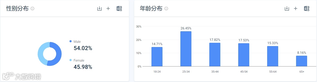 我们先来看一看,OTAA品牌的受众定位是如何的,根据similarweb数据显示,OTAA官网男性用户占比为54.02%,女性用户占比为45.98%,年龄则主要集中在25岁到34岁之间,可见其主要受众就是Z世代男性消费者以及家庭购买者。