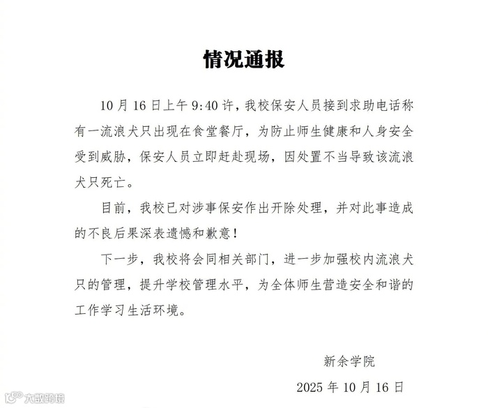 目前,新余学院已对涉事保安作出开除处理,并对此事造成的不良后果深表遗憾和歉意!