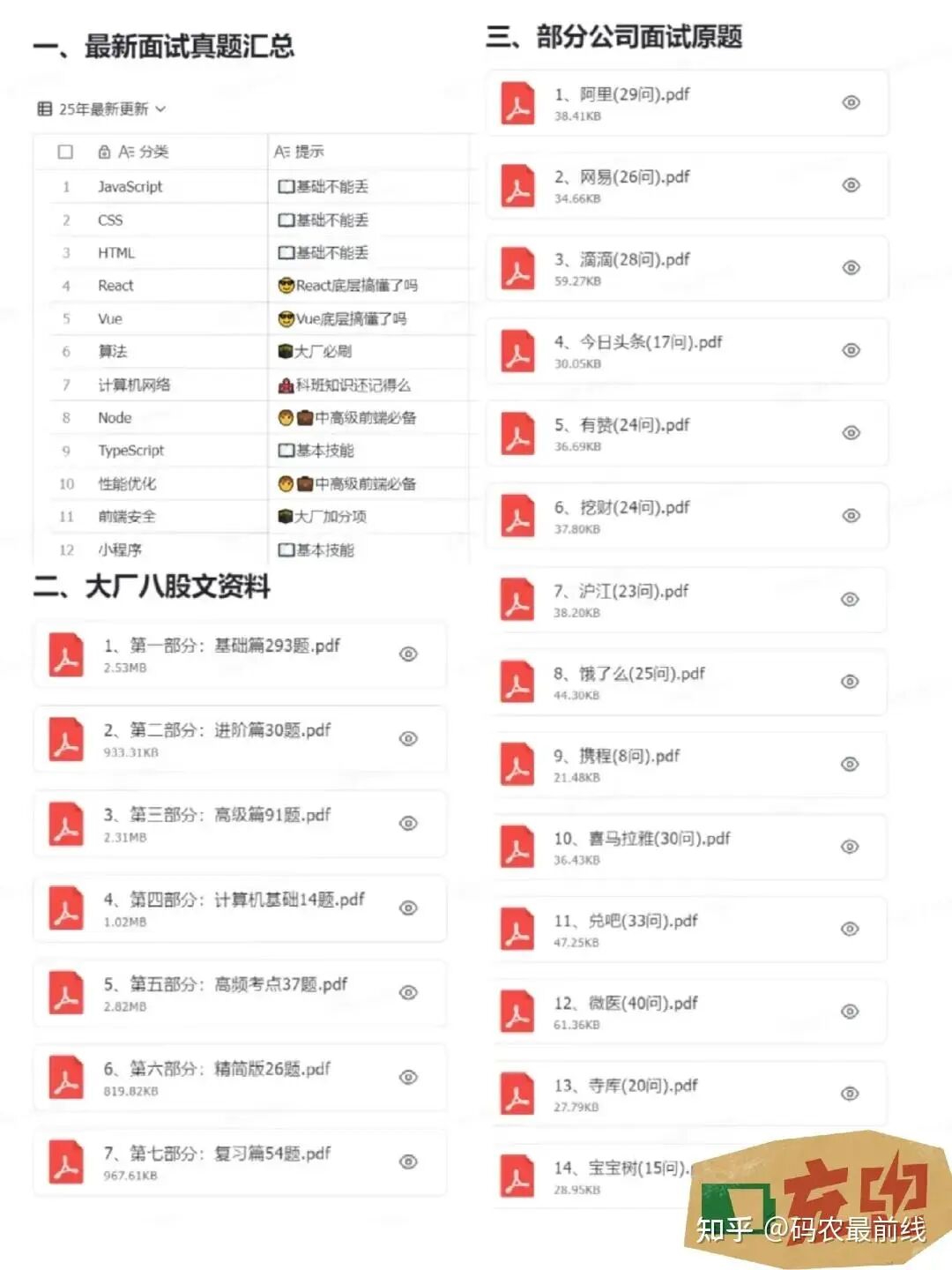 意识到这一点后,我从抱怨转为行动。这半年来,我系统梳理了当前大厂前端面试最高频、最深入的200+道八股文,不仅包含标准答案,更重要的是整理了背后的原理推导和手写代码实现。没想到,正是这份“更底层”的八股文资料,帮助我在最近的面试中拿到了3个offer。