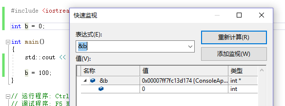 当运行到第7行进行断点时,通过快速监视功能,获取变量b的地址。