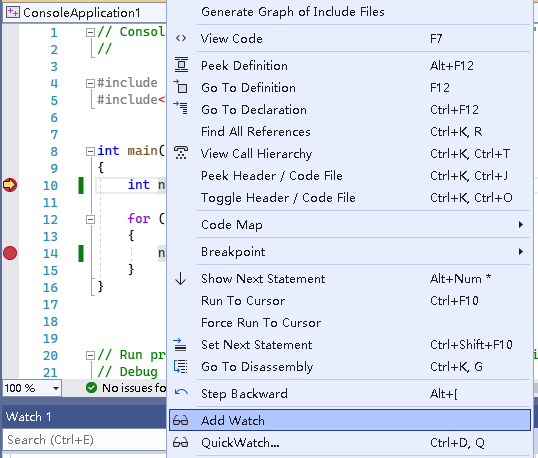 在num = 0处和num++处添加断点,按F5执行程序,将num添加监视。