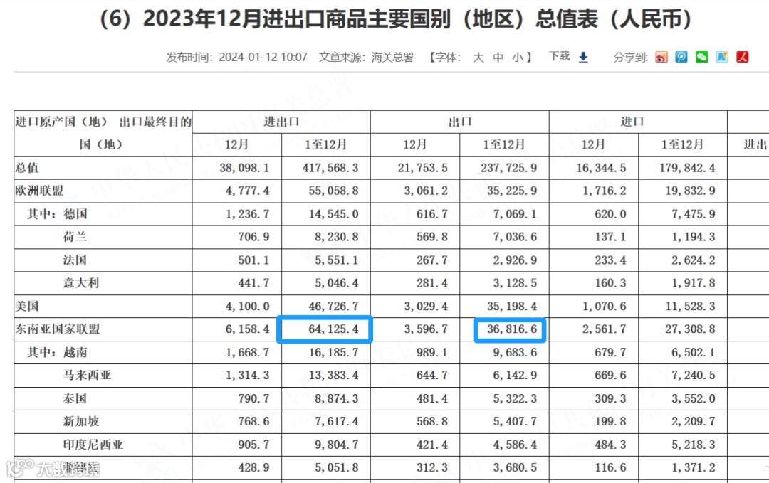 根据海关总署新披露的数据显示,针对东盟地区1至12月的出口额已赶超美国,达到36816.6亿元人民币。