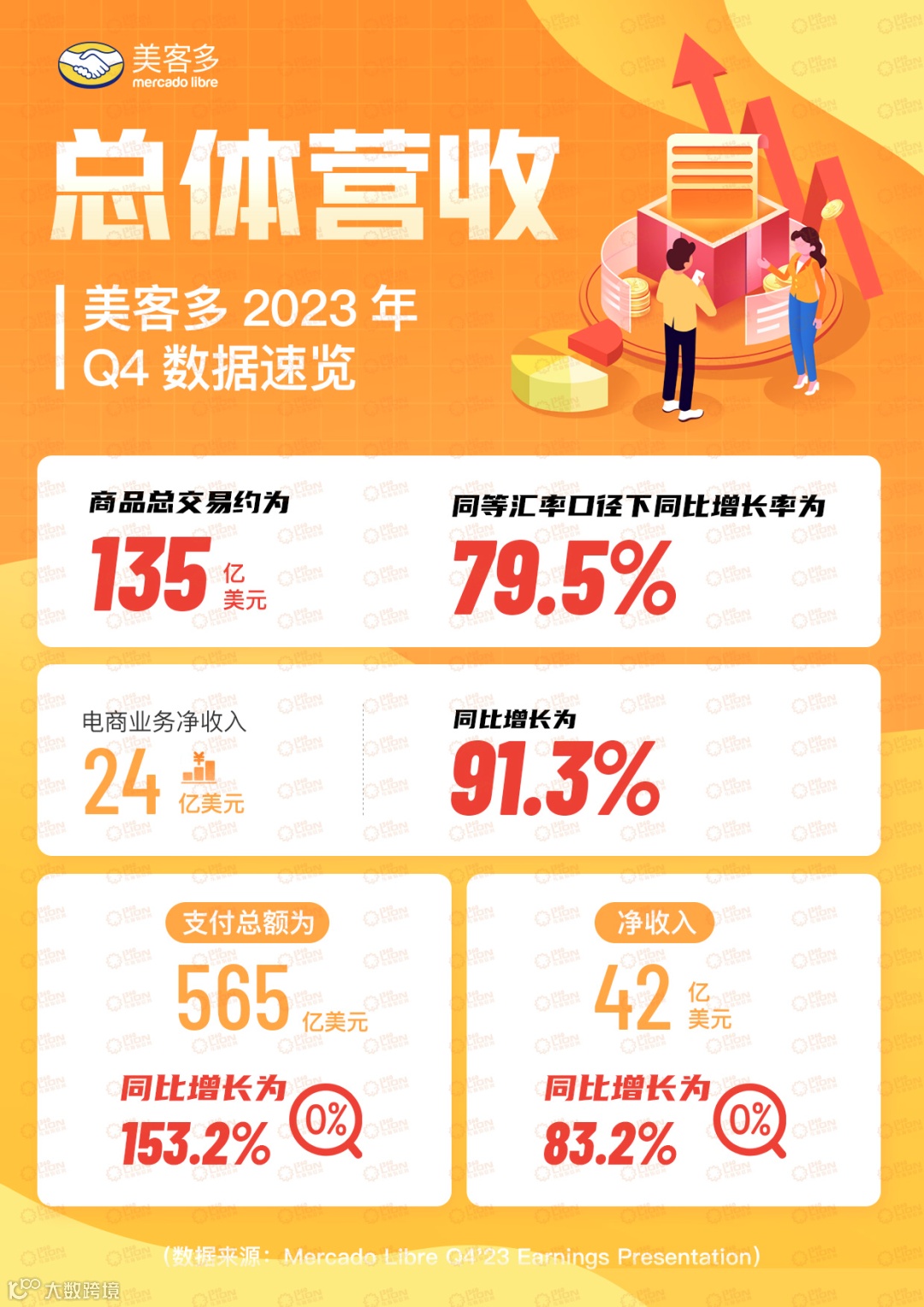 延续了2023年第三季度的骄人业绩,美客多在第四季度创造的商品交易总额(GMV)接近135亿美元,季度GMV再创新纪录,实现了同比增长了79.5%;支付总额为565亿美元,同比增长153.2%。