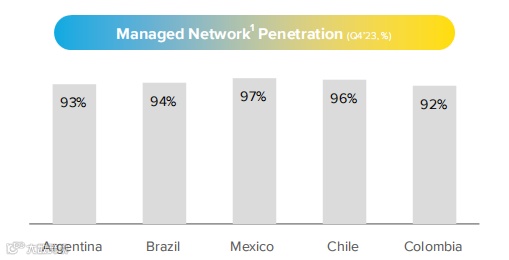 其中包括当日发货和次日发货在内的总体订单量已经超过了1.22亿件,同比增长了21%,由美客多提供物流配送服务的订单量再创新高,占据了发货量的50%,这一数字揭示了美客多物流供应链体系的高效运作实绩。所有运营中心的市场渗透率同比均有所提高,其中巴西的增长最为明显(同比增长超过10个百分点)。