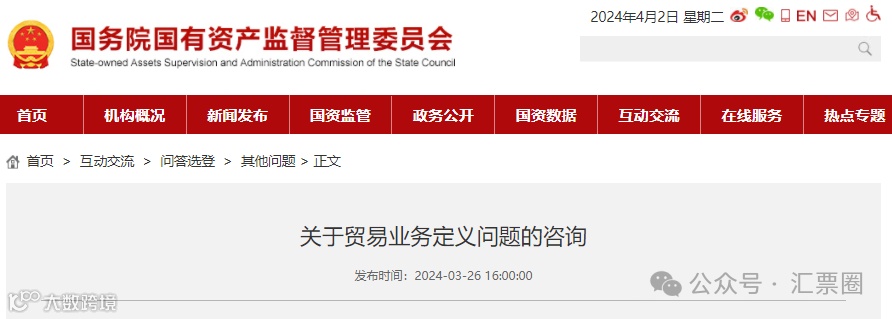 针对企业咨询的贸易业务定义问题,国资委作出回复,明确《关于规范中央企业贸易管理 严禁各类虚假贸易的通知》(国资发财评规〔2023〕74号)中所称的“两头在外”贸易业务,是指原始采购端和最终销售端均在某一家中央企业集团之外的商品买卖活动[[k]]。