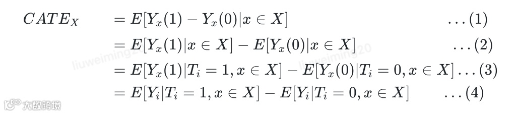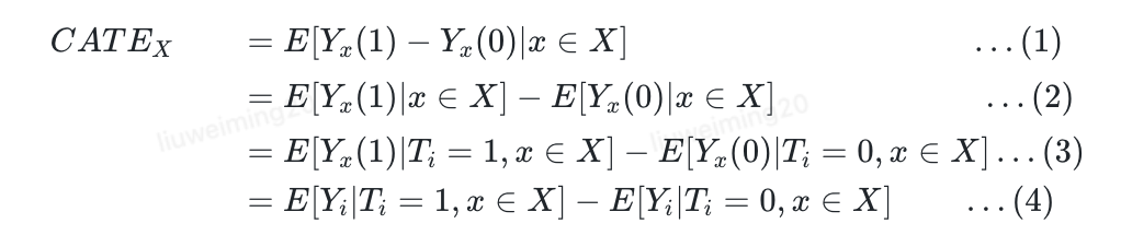 idea1:对于每个参与实验的对象i,如果能得到Y的合理估计,那么ITE就可求了idea2:对于实验人群X,如果能找到一种观测方式,求得E i ( 1 ) ,那么CATE就有了 [ Y x ( 1 ) − Y x ( 0 ) ∣ x ∈ X ]