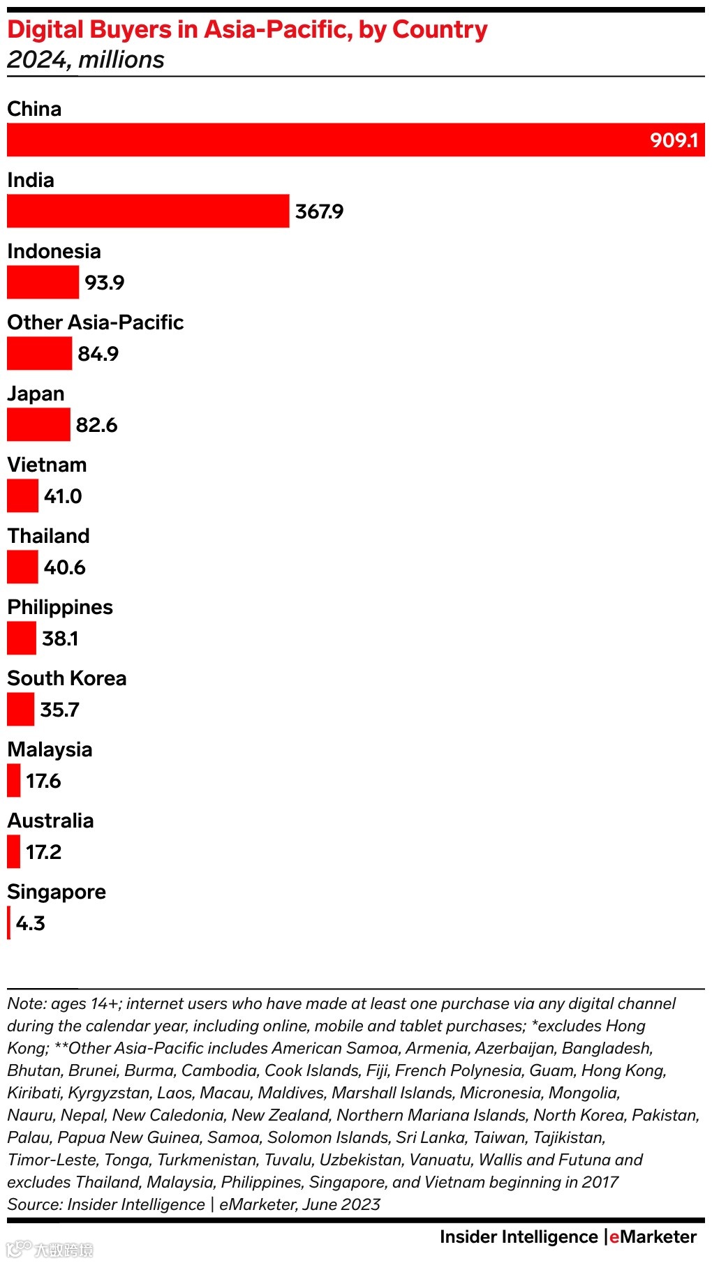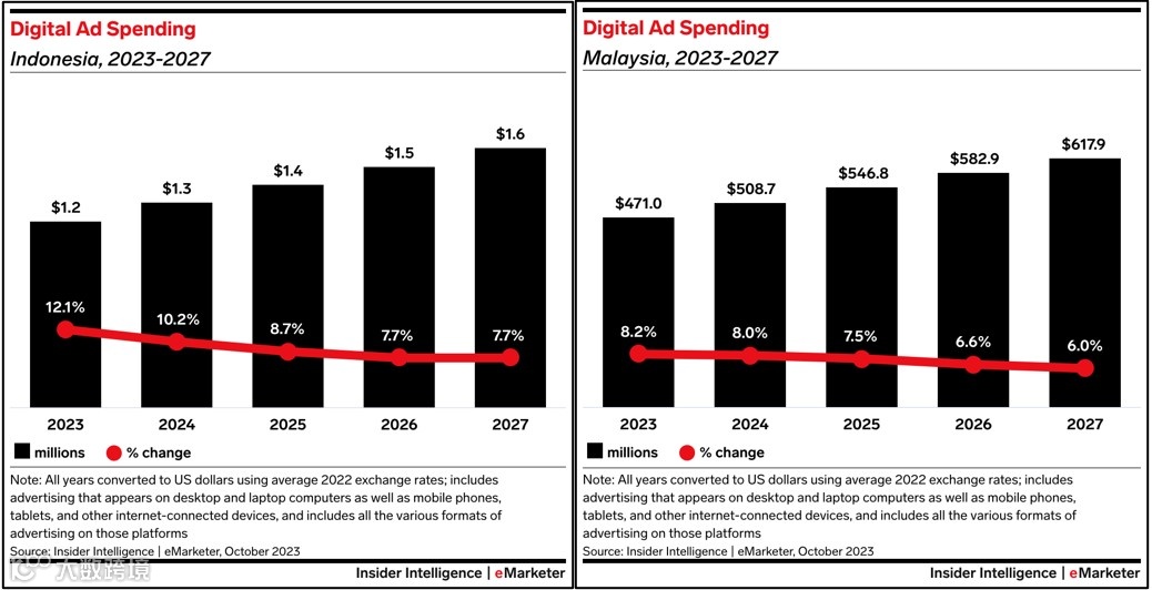 据eMarketer称,到 2024 年,印度尼西亚也将有 9390 万数字买家,马来西亚将有 1760 万数字买家。印度尼西亚和马来西亚的数字广告支出也将继续逐年增长。