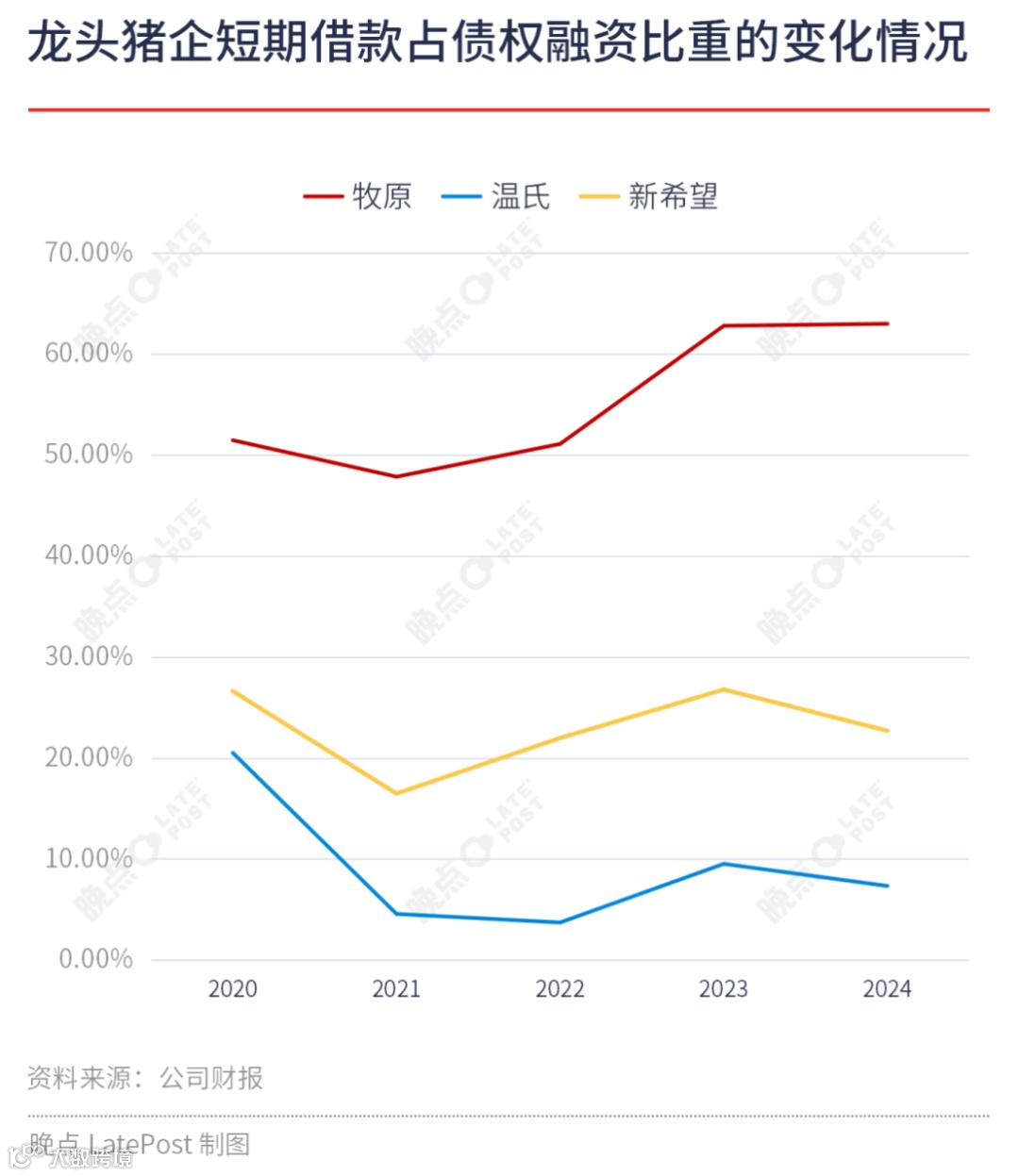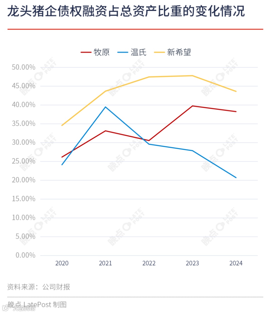 从财务结构看,2020年起三大企业均加大债权融资力度以支撑扩张[k]。近五年数据显示,牧原与新希望的债权融资占总资产比重持续上升,2024年分别达40%和45%;温氏则由高回落至20%,低于2020年水平[k]。