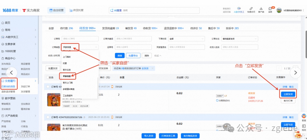 - 商家按订单要求完成备货后,在【1688卖家工作台→已卖出的货品→订单类型→选择“买家自提”】完成系统发货操作;