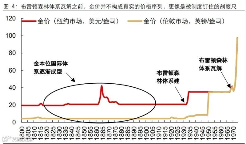 此时黄金即货币,非商品亦非投资资产,而是价值尺度本身。“金本位制”指一国本位货币以固定量黄金表示,各国货币价值由含金量决定,从而构建起稳定固定汇率体系。金价在此阶段无波动,变化的是黄金对商品、薪酬及信用扩张的购买力[2]。