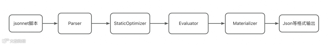 Evaluator: 求值器的作用主要是结合输入的参数(jsonnet 中的 extVar 和 tlaVar) 以及 优化的 AST 进行求值,在过程中将会遍历 AST 并执行相关的逻辑,并最终生成一个 Val (即结果值)。这也就是我们一段 jsonnet 脚本的执行结果了。
