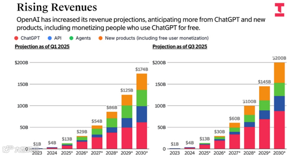 OpenAI引发产业加入的巨额豪赌,必须要依靠规模化的商业应用和收入变现来消化支撑,OpenAI 也制定了相对明确激进的收入增长预期和规划。在2025年第一季度,其预测2025年收入将从40亿美元上升至130亿美元,2030年将达到1740亿美元水平;而到了第三季度,收入预期也进一步拉高,2030年预期收入高达2000亿美元、年均复合增长率高达98%。