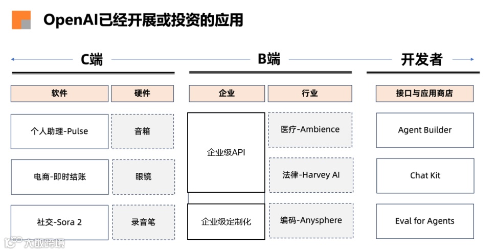 B端企业级市场,又分为标准化API、定制化服务以及行业级应用等,其目前主要通过API进行标准化能力输出作为B端的收入支撑;也正在尝试定制化服务,与美国国防部签署 2 亿美元订单,打造定制AI产品,并从 Palantir 招聘前线部署工程师进行客户所在领域(如国防承包)的模型定制;在行业级,通过投资编码(Anysphere-Cursor)、法律(Harvey AI)、医疗(Ambience Health)领域的AI应用公司进行布局,也尝试通过收购的方式进行扩展行业级收入。