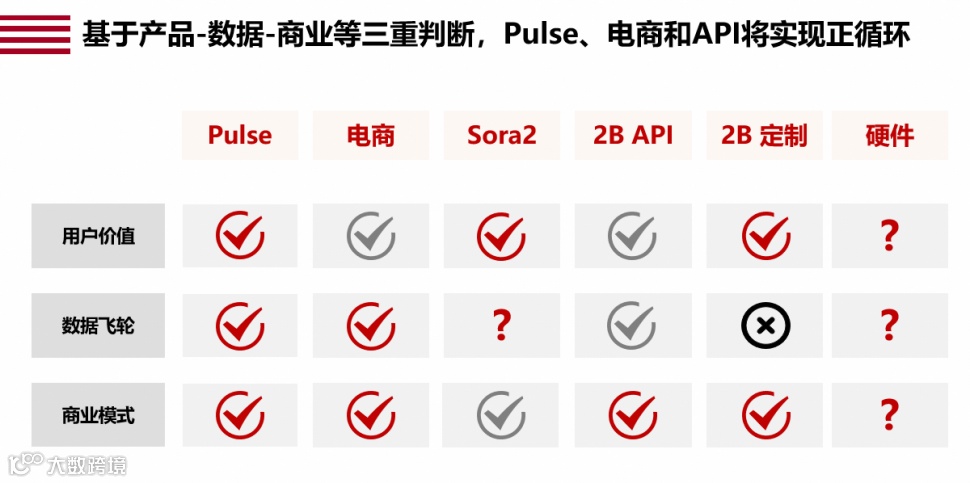 基于这套标准体系,不难发现,个人助理Pulse模式的前景最为突出,在产品方面对用户带来绝对新奇、便捷的智能服务体验,且能根据用户反馈、使用习惯和数据积累形成良性循环,而商业模式上目前仅对Pro会员提供也保障了成本收益、有望拉升整体用户订阅率和客单价。而Sora2虽然在10日内突破300万用户,能提供新奇的体验价值,但是制作成本较高、用户制作比例也远高出抖音等模式,按照传统广告无法覆盖算力成本,OpenAI也表示除API收费外,对这种高成本的生成,可能最终还是得按次收费,目前尚不明确,而数据飞轮何以成立也有待考察。B端定制服务难以建立起飞轮效应,需建立各客户专有模型,虽然能通过更高定价覆盖成本,但是速度较慢、周期更长、压力更大。其他业务不再单独赘述,仅就目前情况作初步梳理,值得长期持续跟踪并实时更新调整。