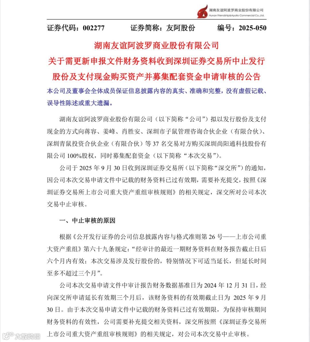 根据公告,友阿股份于2025年9月30日收到深交所通知,因本次交易申请文件中记载的财务资料已过有效期,需要补充提交。