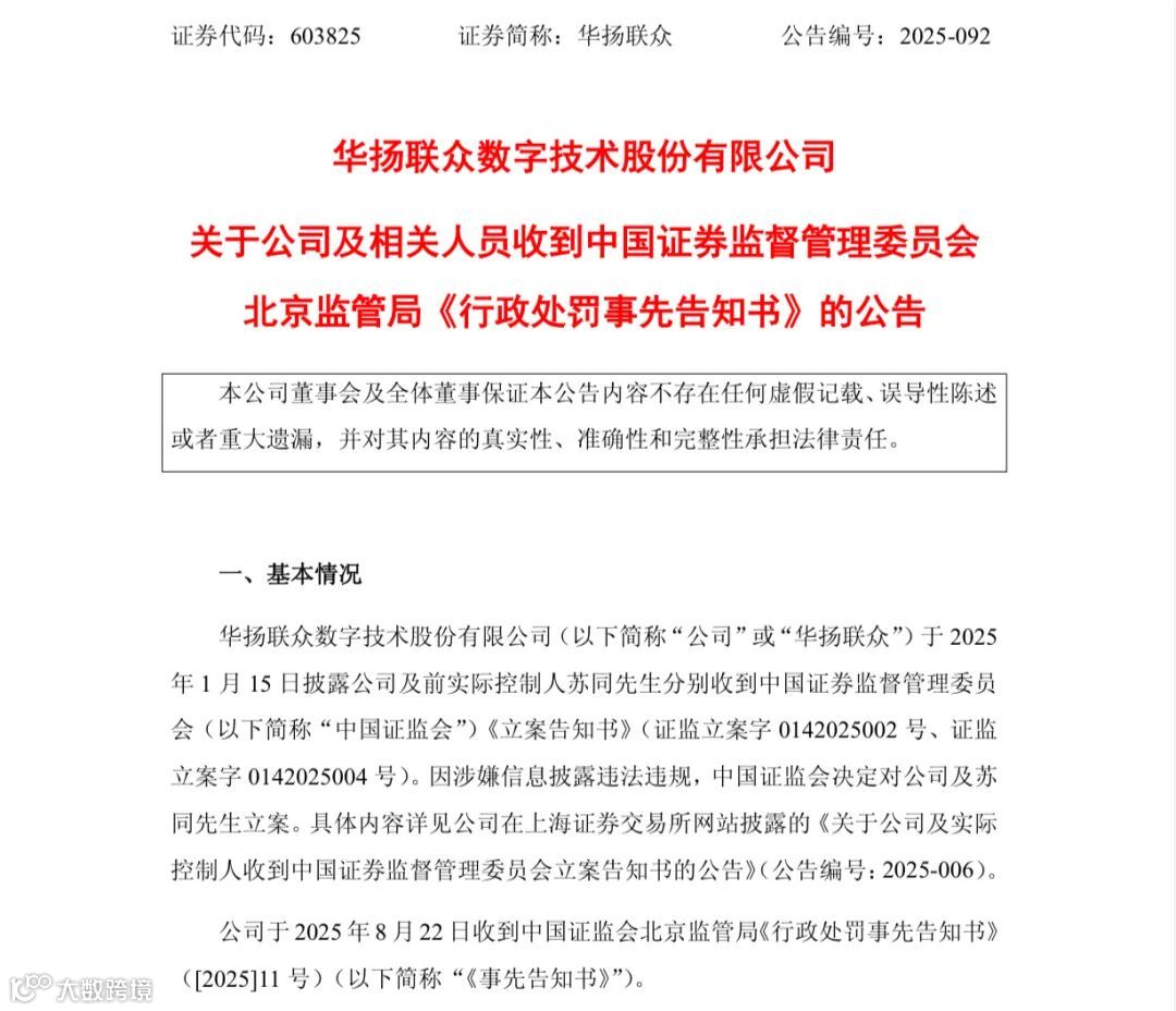 8月22日晚,华扬联众数字技术股份有限公司(603825)连续发布多份公告,披露公司及相关人员收到中国证监会北京监管局《行政处罚事先告知书》。
