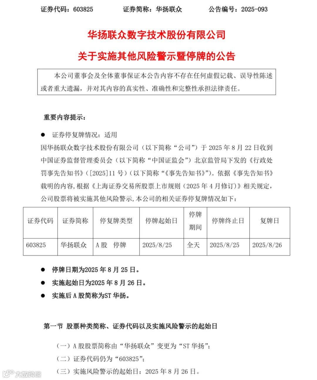 根据公告,华扬联众股票将于2025年8月25日停牌1天,2025年8月26日起实施其他风险警示。实施其他风险警示后,A股股票简称由“华扬联众”变更为“ST华扬”。