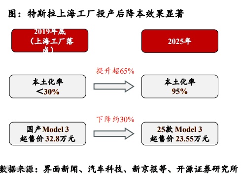 根据开源证券研究报告显示,自2019年特斯拉上海工厂落地以后,四年多的时间里,其就将本地化率从30%提升至95%,与此同时汽车价格更是下降了30%。