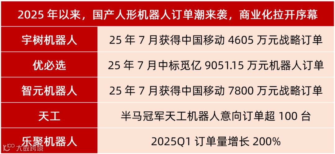 另一方面,2025年以来,国内人形机器人迎来了订单潮。根据开源证券研究报告,某人形机器人龙头企业2025年前5月中标量已接近2024年全年;更有多家公司相继斩获单个数千万元级战略订单。