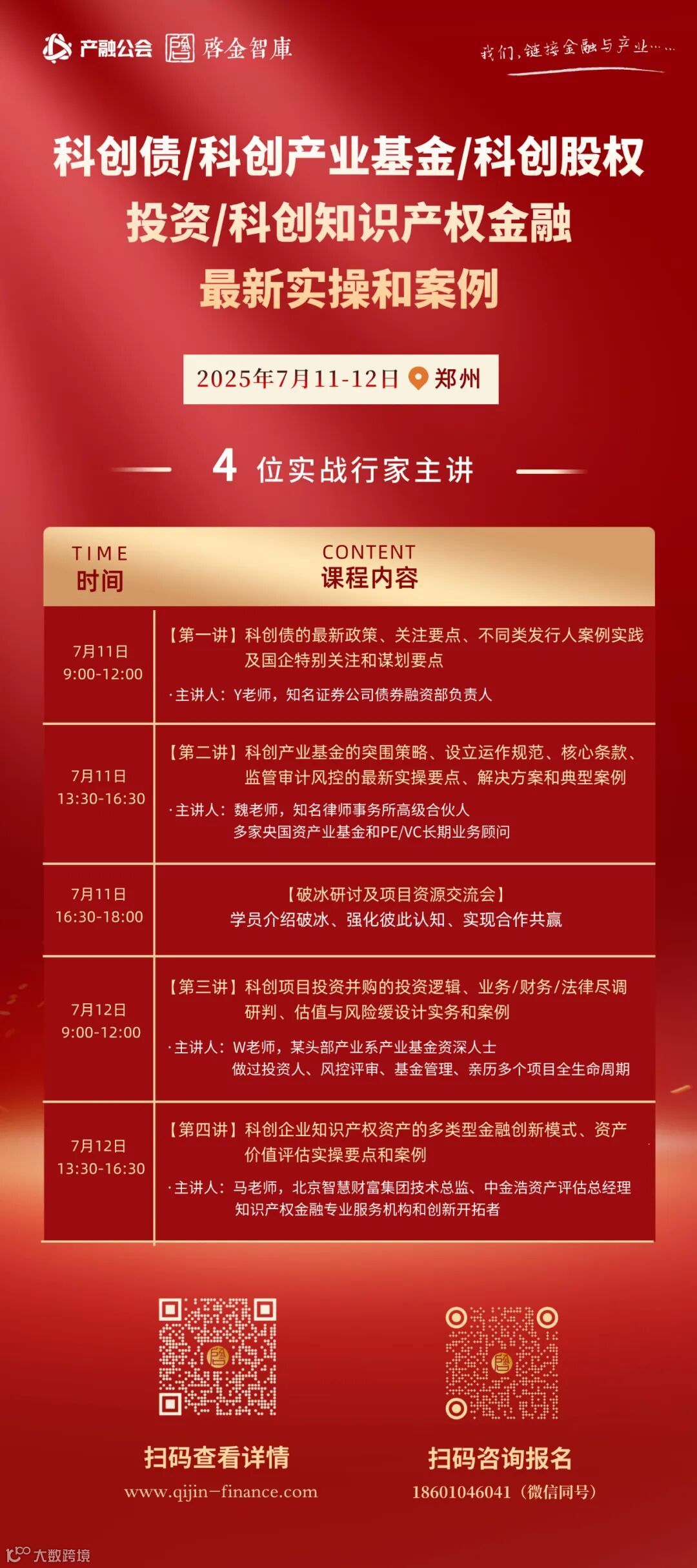 启金智库 & 产融公会 将于2025年7月11-12日(周五/六)在郑州 举办《科创债+科创产业基金+科创股权投资+科创知识产权金融最新实操专题培训班》,本期特邀4位实战派主讲嘉宾,深入分享最新政策运用要点、实操运作要点、案例经验总结,洞悉业务运作中的各类细节和捕捉趋势把握机遇,助您建立展业必备的知识体系、实战技能、稀缺经验和有效人脉,诚邀您的参加!