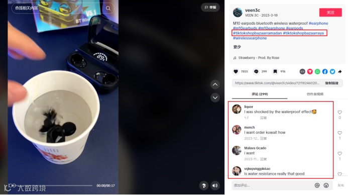 图源tiktok@veen3c,卖家在2023斋月大促活动中展示蓝牙耳机的防水效果