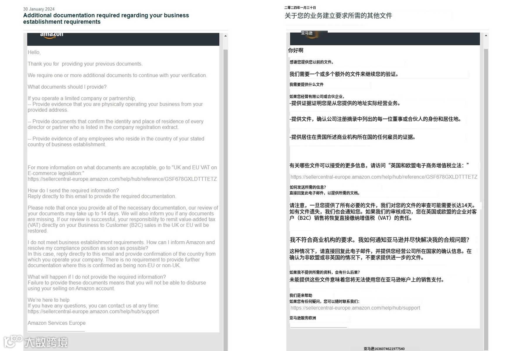 近段时间来,有不少卖家收到来自亚马逊的审查通知邮件,要求在收到通知后60天内提供相关材料文件证明其在欧洲开设本地公司,倘若卖家无法在规定时间提供证据,亚马逊将认定卖家未在英国成立,并将开始针对卖家的B2C销售收取和代缴增值税。以下是客户收到的邮件通知内容:
