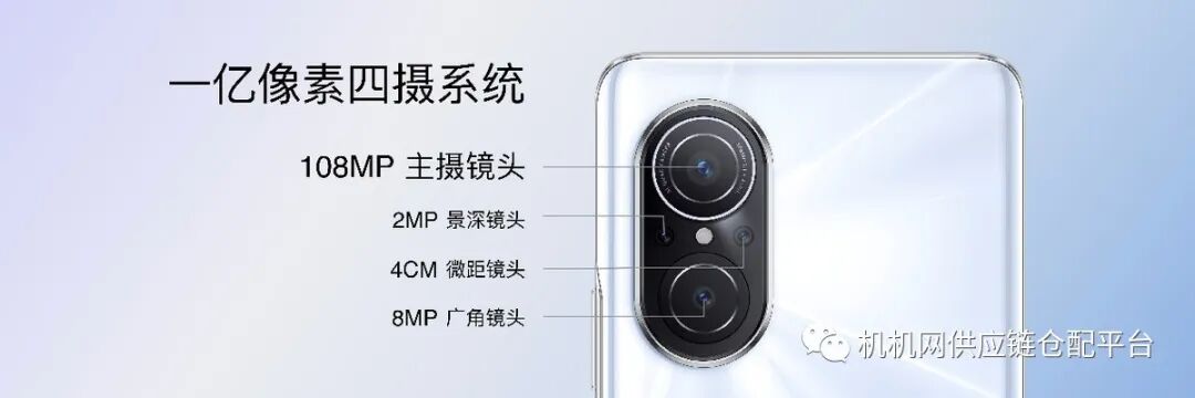 Hi nova 9 SE后置搭载了一颗1.08亿像素主摄、一颗800万像素112°超广角镜头、一颗200万像素的景深镜头和一颗200万像素的微距镜头。其中1.08亿像素超高清主摄镜头采用一块1/1.52英寸大尺寸传感器,配合多帧融合技术,通过像素级画质处理算法,为每一次拍摄提供精细的画质优化。