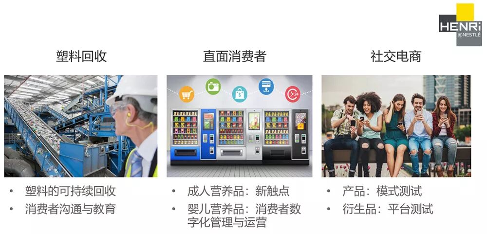 雀巢中国于2019年6月正式启动第一期HENRi@Nestlé雀巢中国加速营计划,公开招募国内创业公司,就塑料包装回收、直面消费者、社交电商增长三大主题,共同探索创新解决方案与业务实践。
